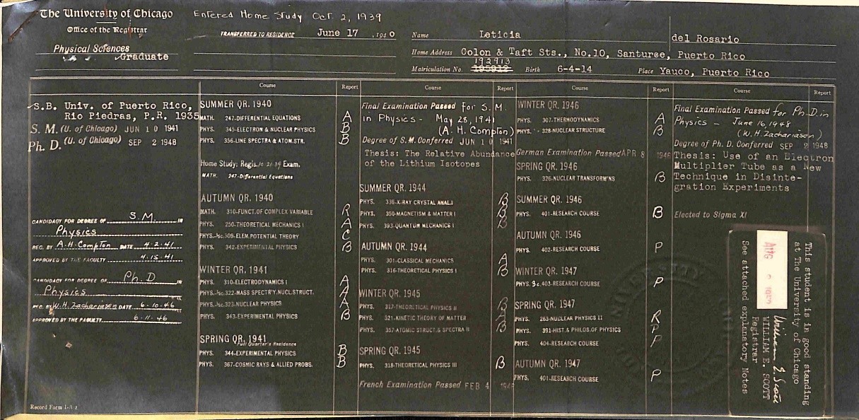 La Dra. Leticia del Rosario, nació en Yauco, Puerto Rico en 1914. Obtuvo su bachillerato en Ciencias, Manga Cum Laude, con una especialización en física y matemáticas, de la Universidad de Puerto Rico en 1935, una maestría en ciencias, con especialidad en física atómica de la Universidad de Chicago en 1941 y un doctorado en Física de la misma universidad en 1948. Luego, pasó a Oak Ridge National Laboratory, para tomar un curso especializado en radioisótopos. Comenzó a trabajar como docente en la Universidad de Puerto Rico en 1941 hasta el 1973 en el Departamento de Física y Matemáticas de la Facultad de Ciencias Naturales, dirigiendo ese departamento desde el 1949 al 1954. Además, fue directora del Departamento de Ciencias Físicas de la Facultad de Estudios Generales desde el 1 de enero de 1964 al 1966. En 1970 al 1973 fue la primera mujer Decana de Estudios en el Recinto de Río Piedras de la Universidad de Puerto Rico, (Certificación Núm. 46, 1970-71 CES). Como académica del recinto riopedrense de la UPR, dirigió el proyecto In-service Institute for Secondary School Teachers of Science and Mathematics (1961-62) subsidiado por la Fundación Nacional de Ciencias (NSF, en inglés) y dirigió el Cosmic Ray Laboratory desde el que se desarrollaron proyectos de investigación que resultaron en la publicación en la revista de mayor prestigio en física, Physical Review. Leticia del Rosario, fue la primera mujer puertorriqueña en obtener un doctorado en física, pionera en la física, prestigiosa científica, ex directora del Instituto de cultura Puertorriqueño y Profesora Emérita en 1974. Fallece en el 2009 a sus 95 años de edad.