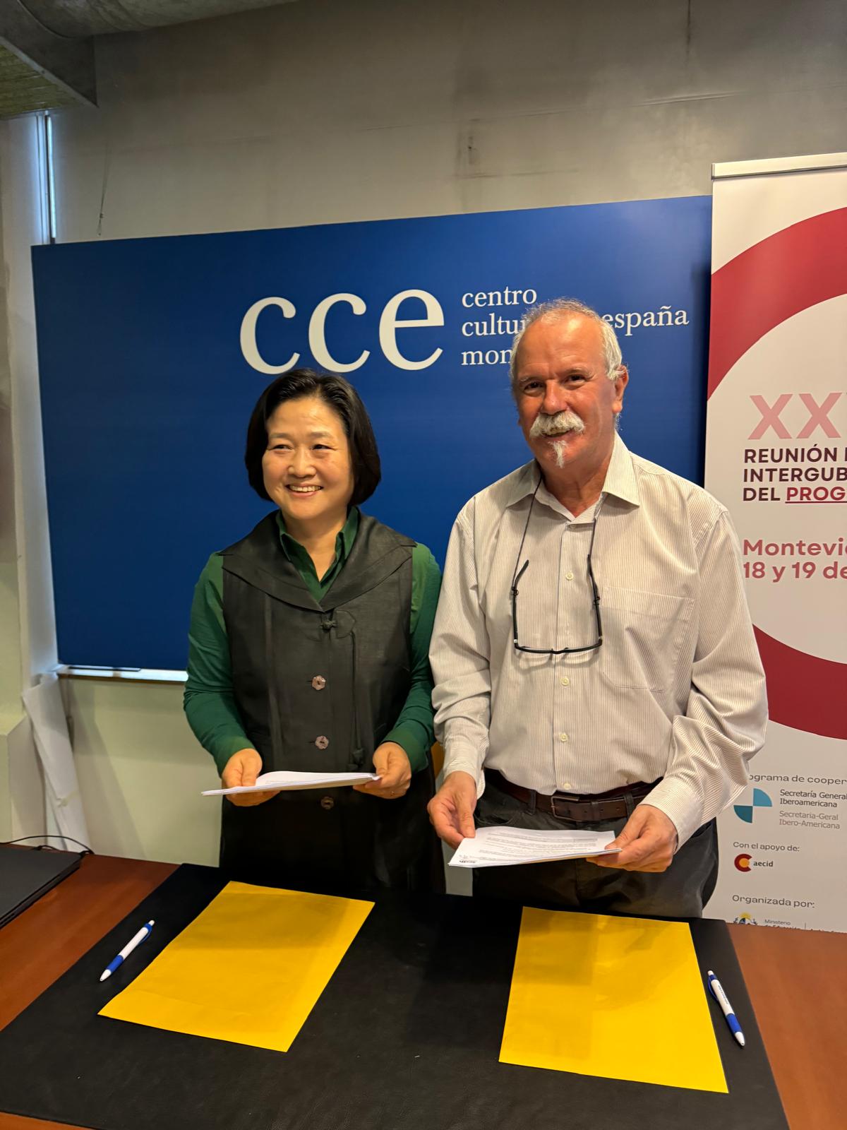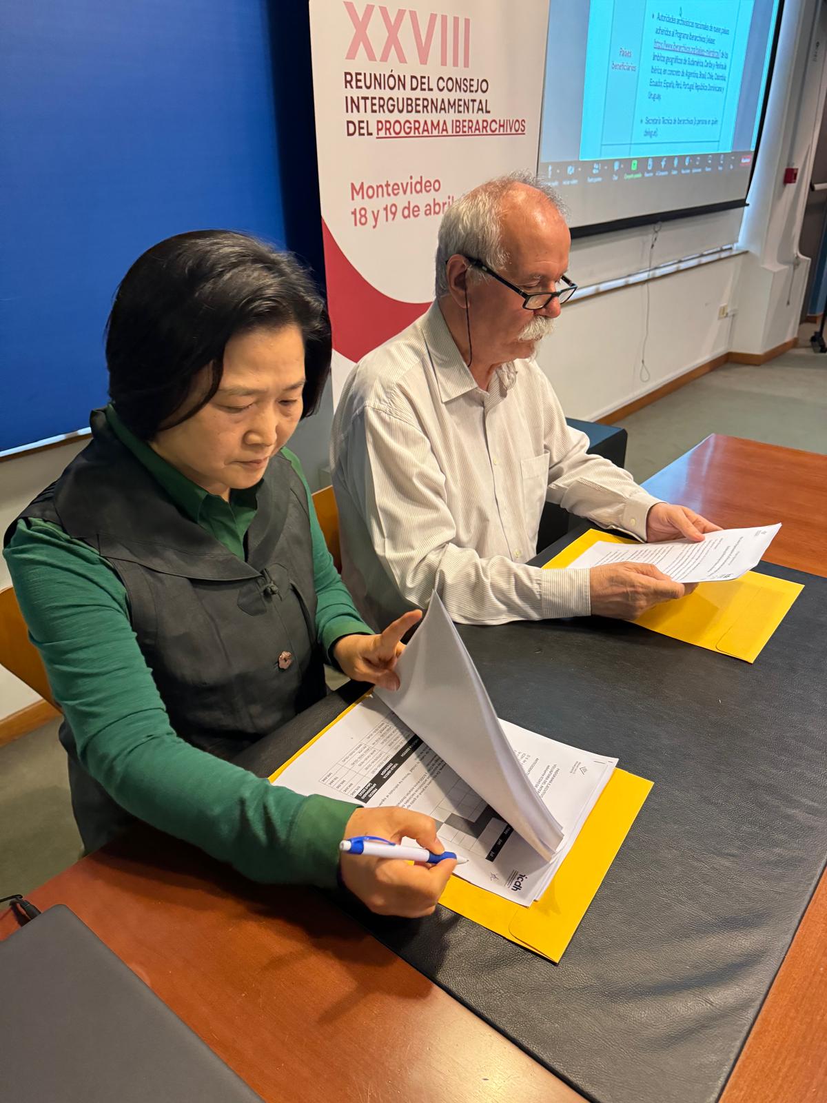 Texto DeclaraciónEn materia de cooperación, se firmó un acuerdo con el Centro Internacional de Patrimonio Documental de la UNESCO en Corea (ICDH), para la realización de una capacitación sobre Patrimonio Documental.Participan en este acto el Presidente del Programa Iberarchivos y la Secretaria General del ICDH.