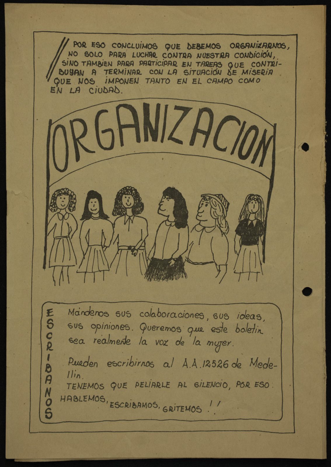 Por medio de este boletín y otros similares, mediante ilustraciones y textos cortos y sencillos, se invitaba a las mujeres de los sectores populares a tomar conciencia de su realidad, organizarse y participar enviando sus opiniones y propuestas: “tenemos que peliarle al silencio, por eso hablemos, escribamos, gritemos!!”.