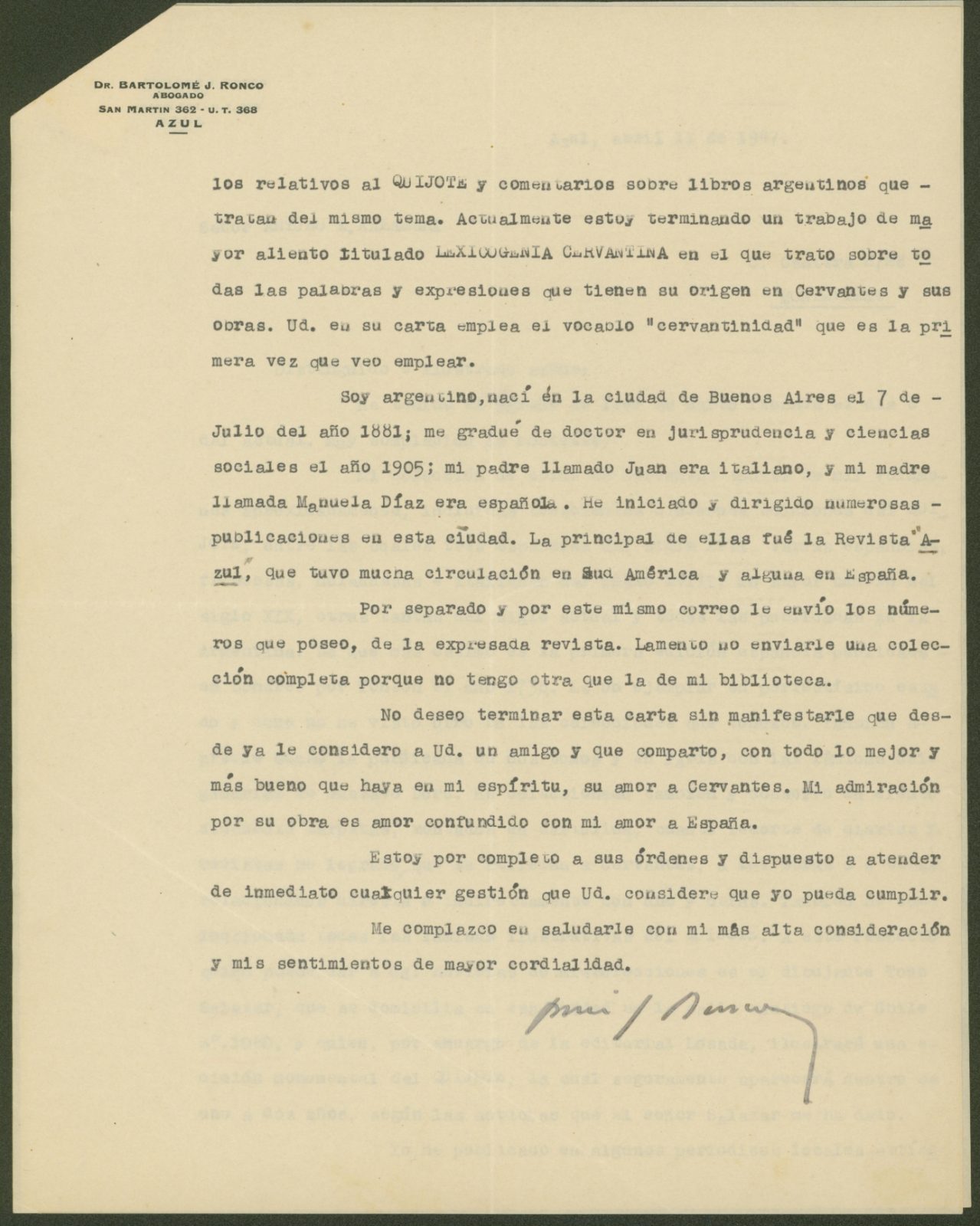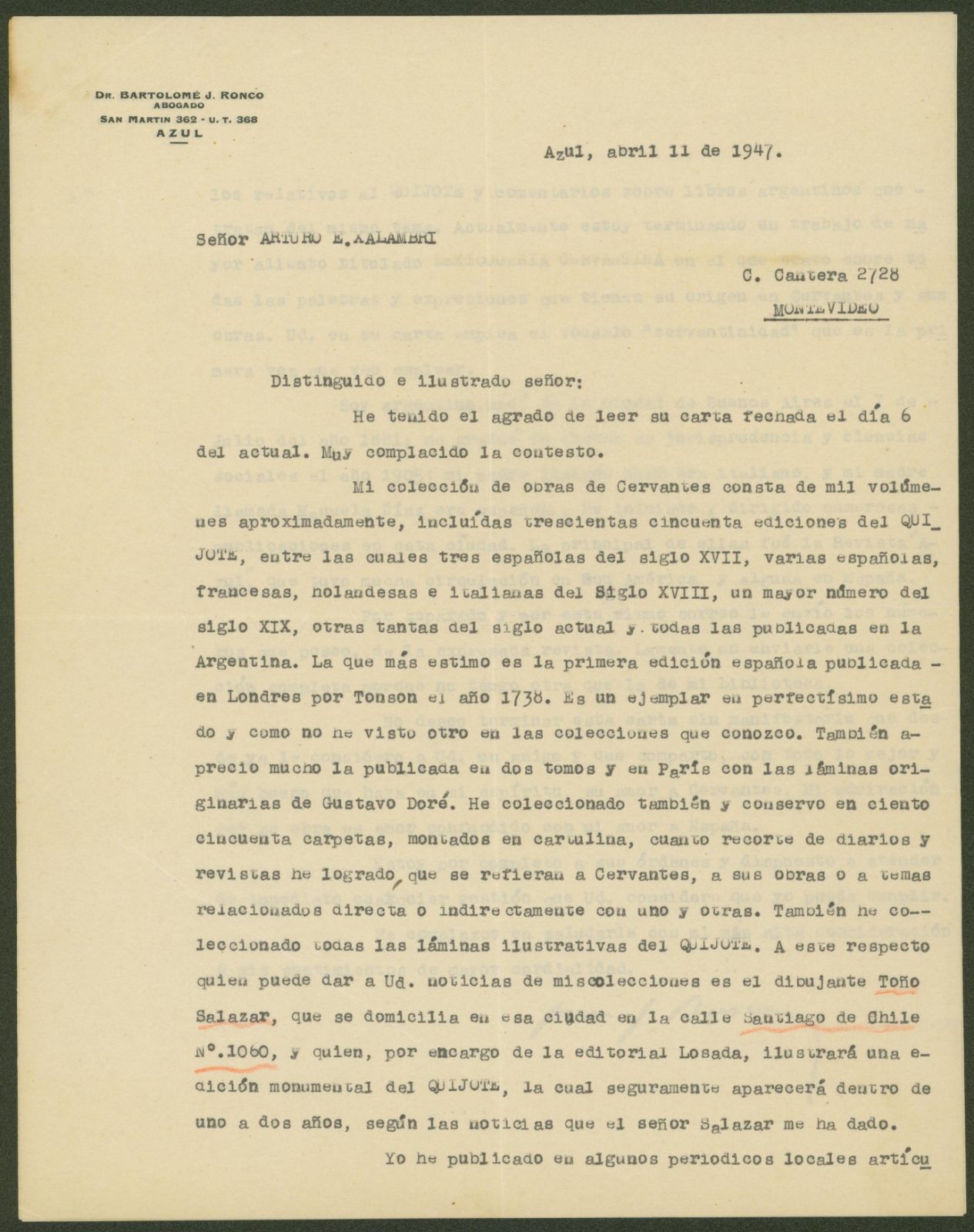 “Letter from Bartolomé José Ronco to Arturo Xalambrí (1947-04-11)”.