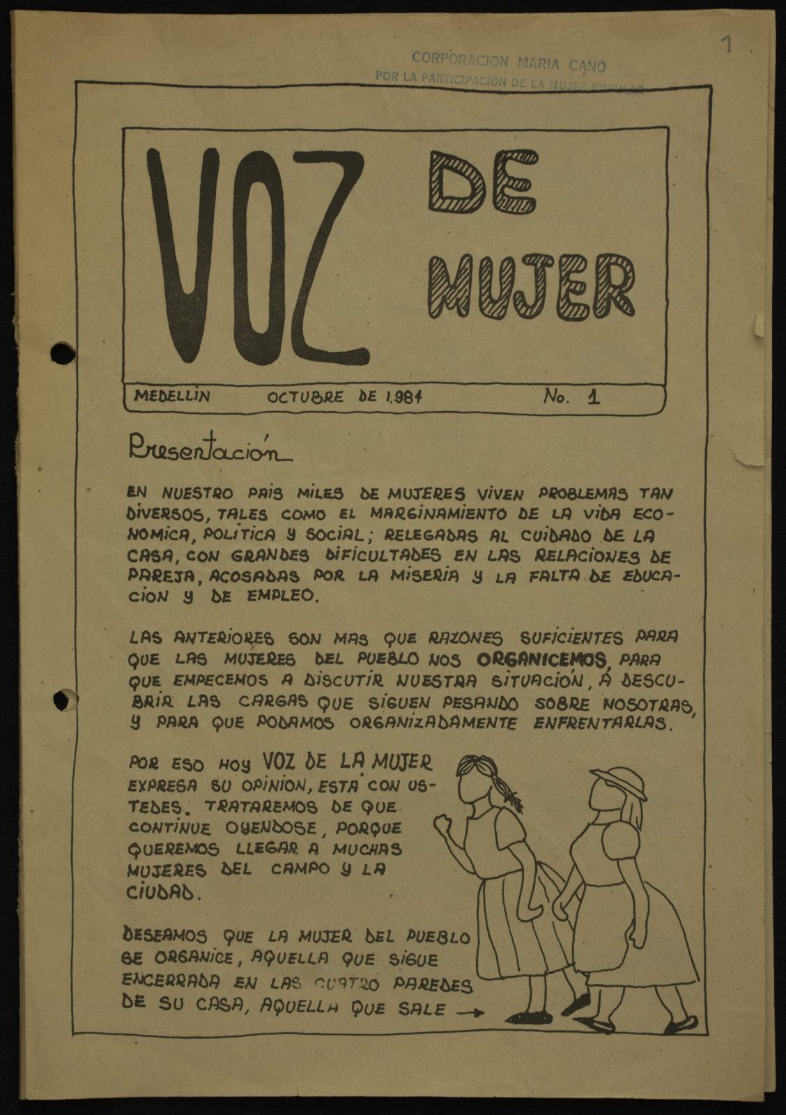 This document is the first issue of Voz de Mujer, a newsletter produced by the Grupo por la organización de la mujer del pueblo. It is a serialised publication that forms part of the Vamos Mujer – Movimiento Social de Mujer (AHVM-MSM) Historical Archive, kept in the Historical Sources Laboratory of the Faculty of Humanities and Economics at the National University of Colombia, Medellín. This archive was donated by Corporación Vamos Mujer to the university in 2021 and contains the Inactive Administrative Archive, Documentation Centre, Plans Library, Video, Home Video, Audio, Optical and Magnetic sections.