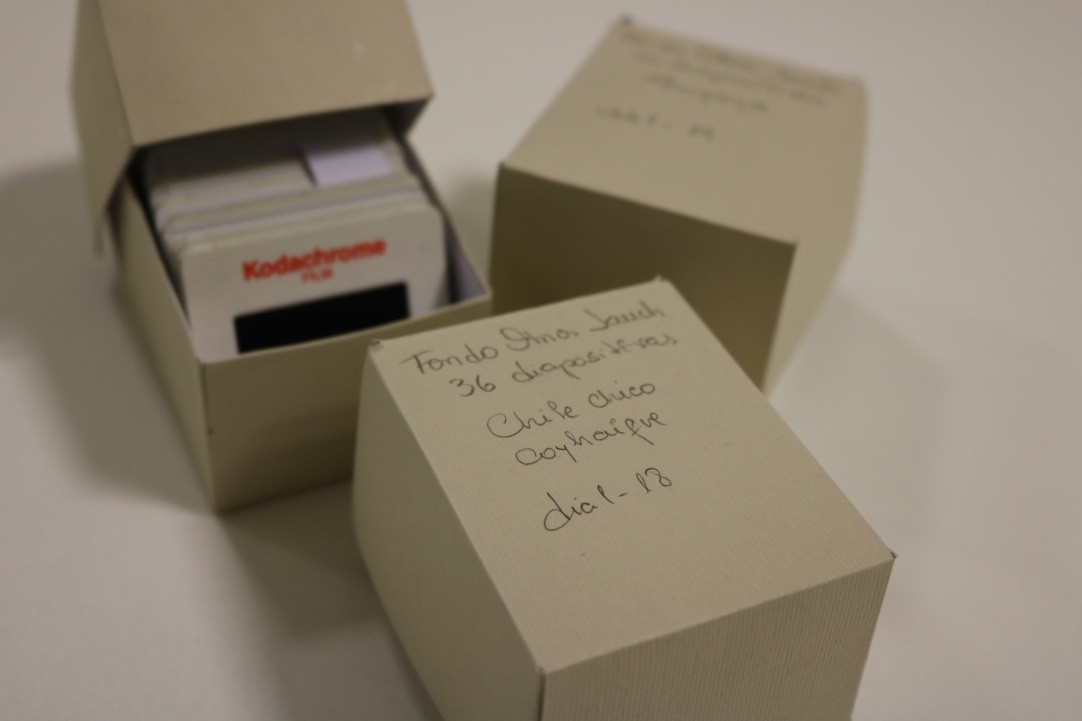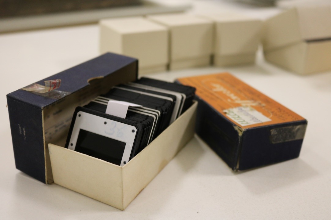 - Colección de diapositivas. Después de la conservación, almacenadas en cajas fabricadas con cartón libre de ácido.