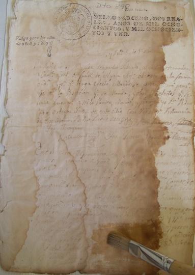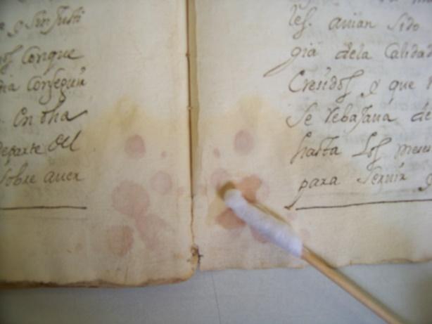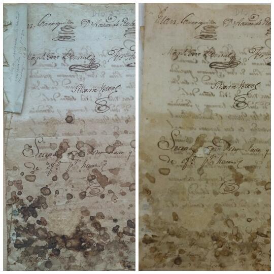 - 2. Foto de registro del documento 3332. En la imagen del lado izquierdo se observa el estado inicial del documento y la del lado derecho se evidencia el cambio después de un lavado por inmersión.