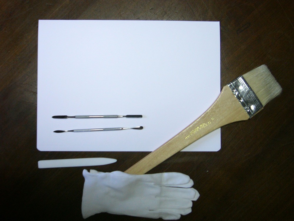 - Herramientas para el trabajo de conservación: carpeta libre de ácido, brocha, espátulas, plegadera y guantes de algodón