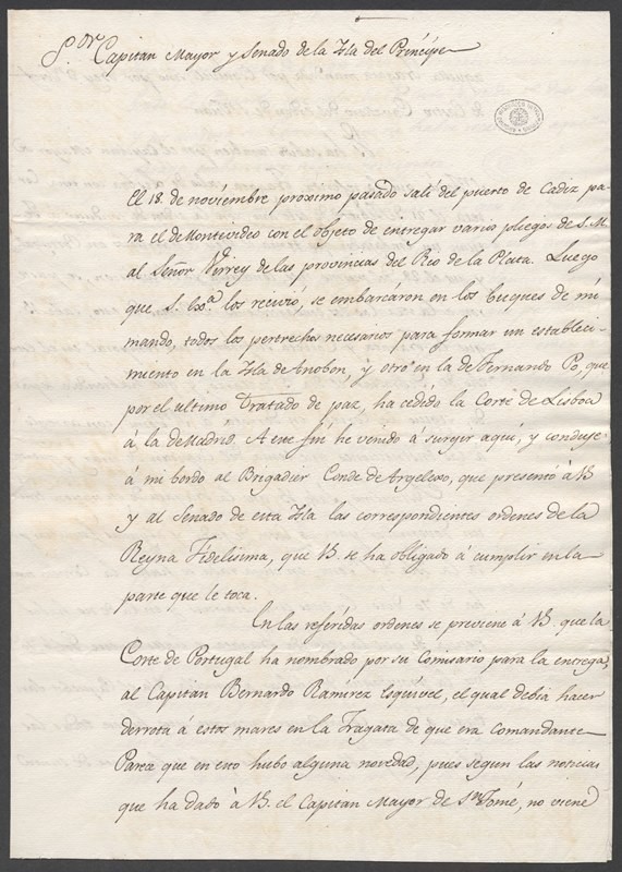 - 25-07-1778, Príncipe, Fragata Santa Catalina – Carta do comandante Josef Varela ao capitão-mor e Senado do Príncipe, sobre a entrega de Ano Bom (Annobón) e Fernando Pó (Bioko) a Espanha