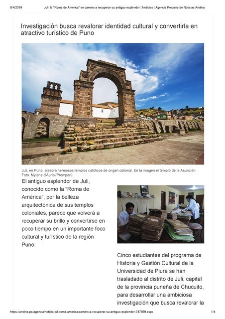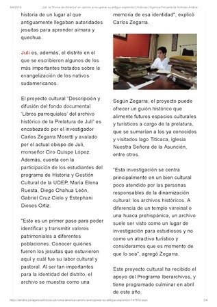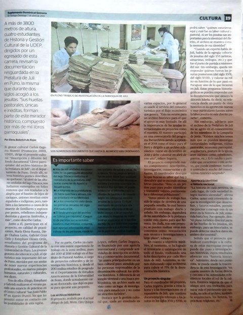 El proyecto que busca conocer, organizar y conservar casi mil libros, un proyecto seleccionado por Iberarchivos (código 2016/157). El objetivo era desarrollar las labores de descripción documental del fondo “Libros Parroquiales” disponibles en el archivo de la Prelatura de Juli y mejorar el entorno virtual disponible que, a su vez, hacía de buscador.
