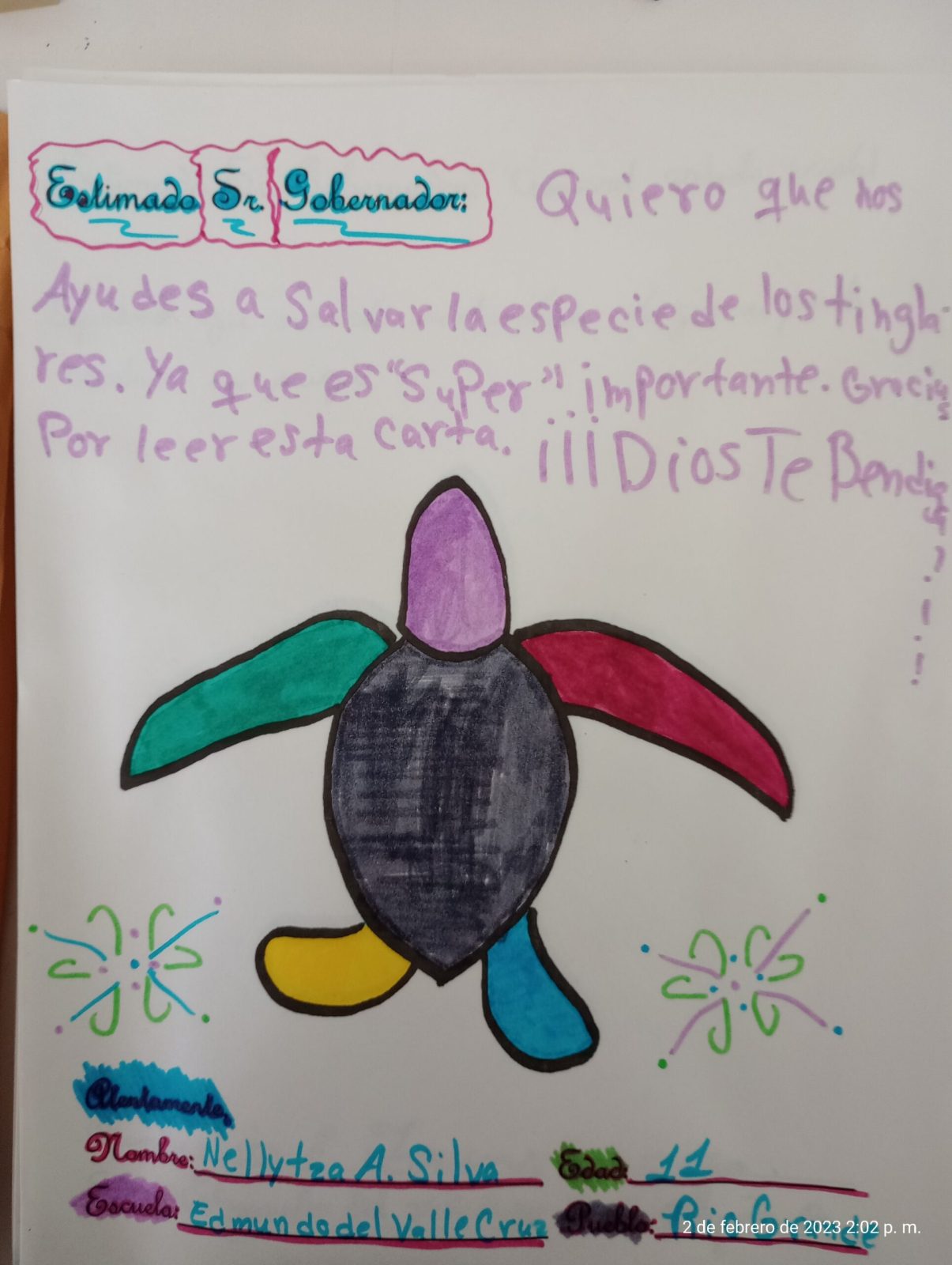 - Del festejo anual del Festival del Tinglar, dibujo de la niña Nellytza Silva de 11 años peticionando ayuda para la conservación del tinglar.