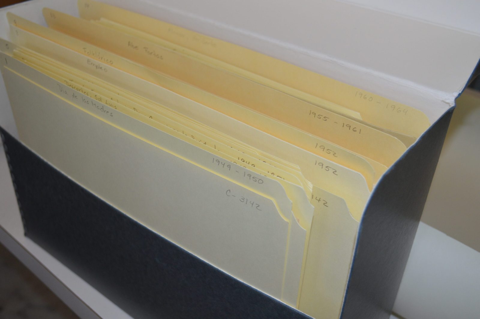 - Expediente con diversidad de calidades de papel como recorte de prensa y de correspondencia mezclados, de la década de 1950 (FOG), se aprecia el daño causado por la oxidación de papel.