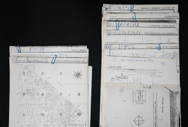 - Fotocopias de planos urbanos utilizados para la localización de los Centros Clandestinos de Detención que funcionaron en la última dictadura, acondicionados como parte de las tareas de conservación