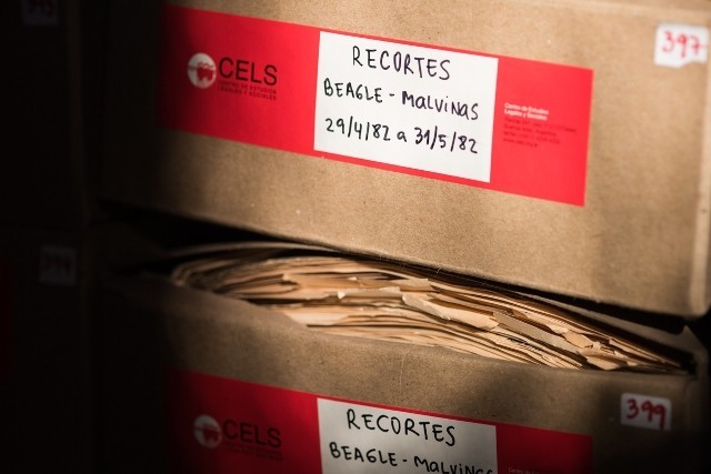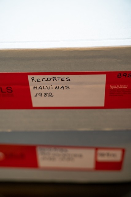 - Recortes periodísticos sobre el conflicto entre Argentina y Chile por el canal de Beagle (1978) y sobre la guerra de Malvinas (1982) almacenados en cajas de cartón, al inicio del proyecto