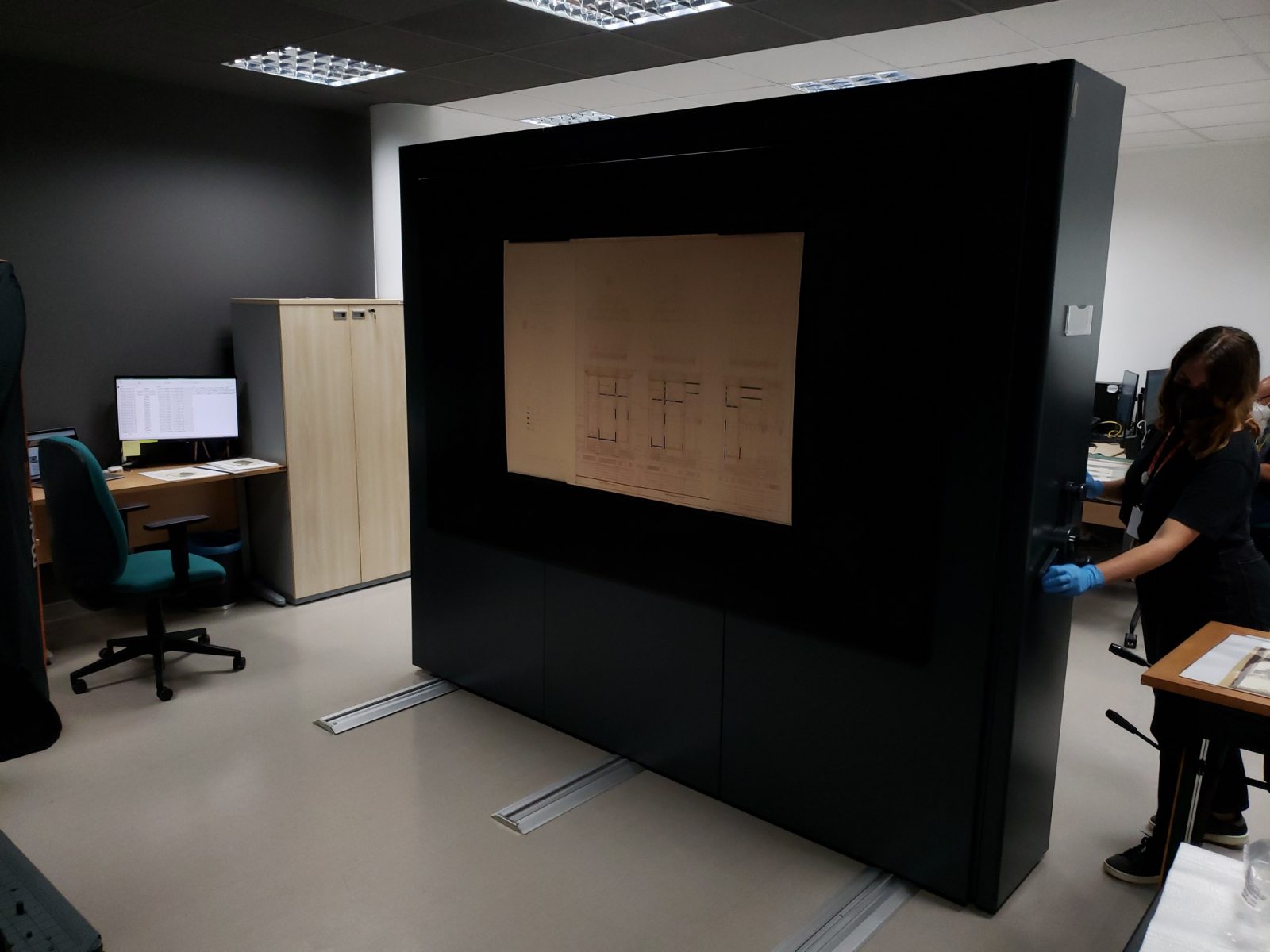 - Natalie Rickli digitalizando documento de grande formato do fundo Sarah Hawker em scanner planetário