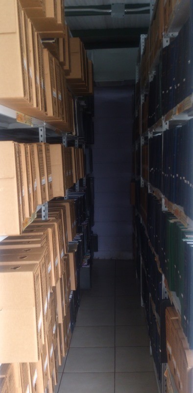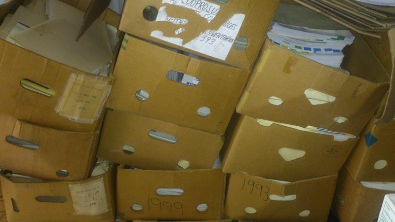 - Cajas apiladas en los pasillos del archivo con documentos sin describir