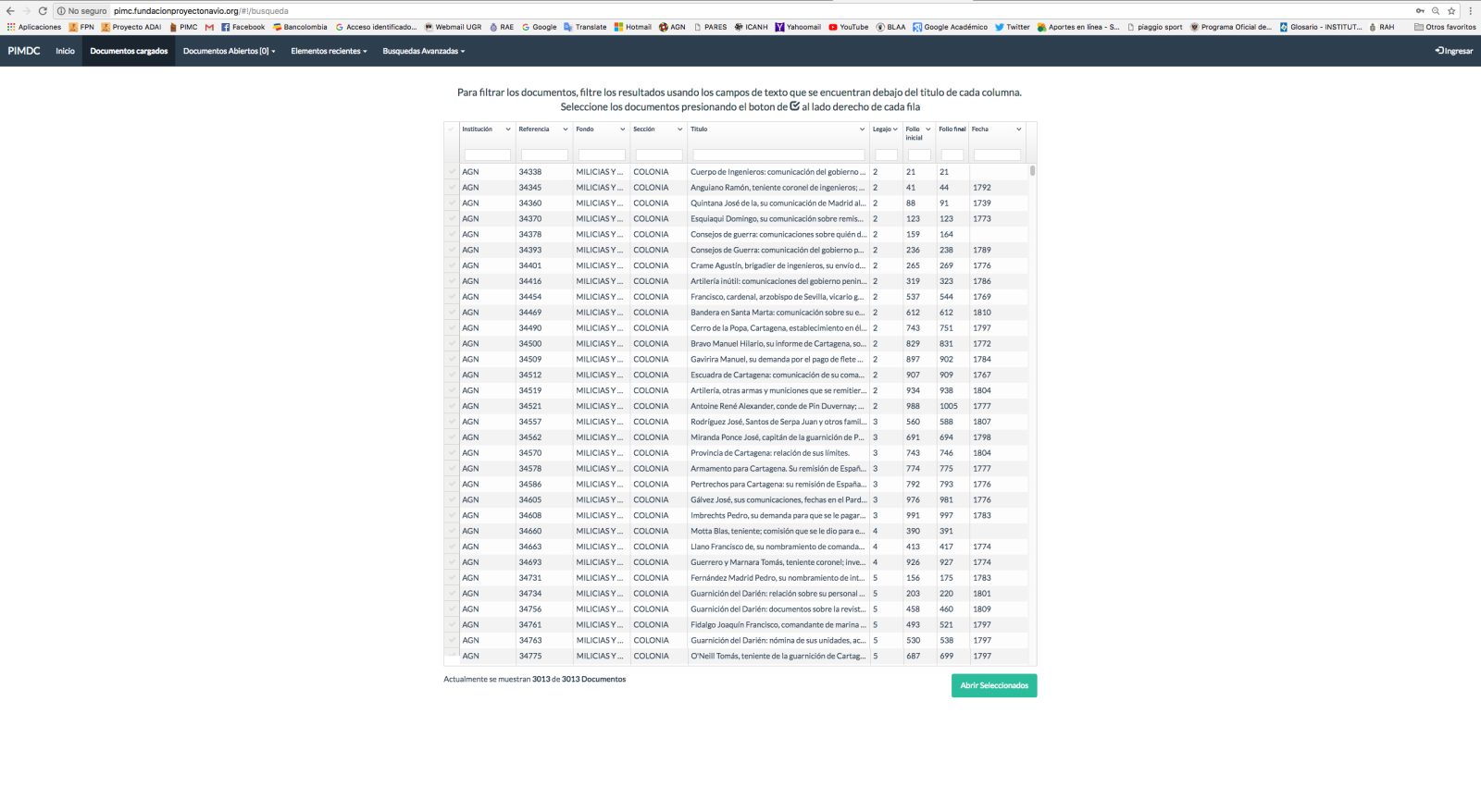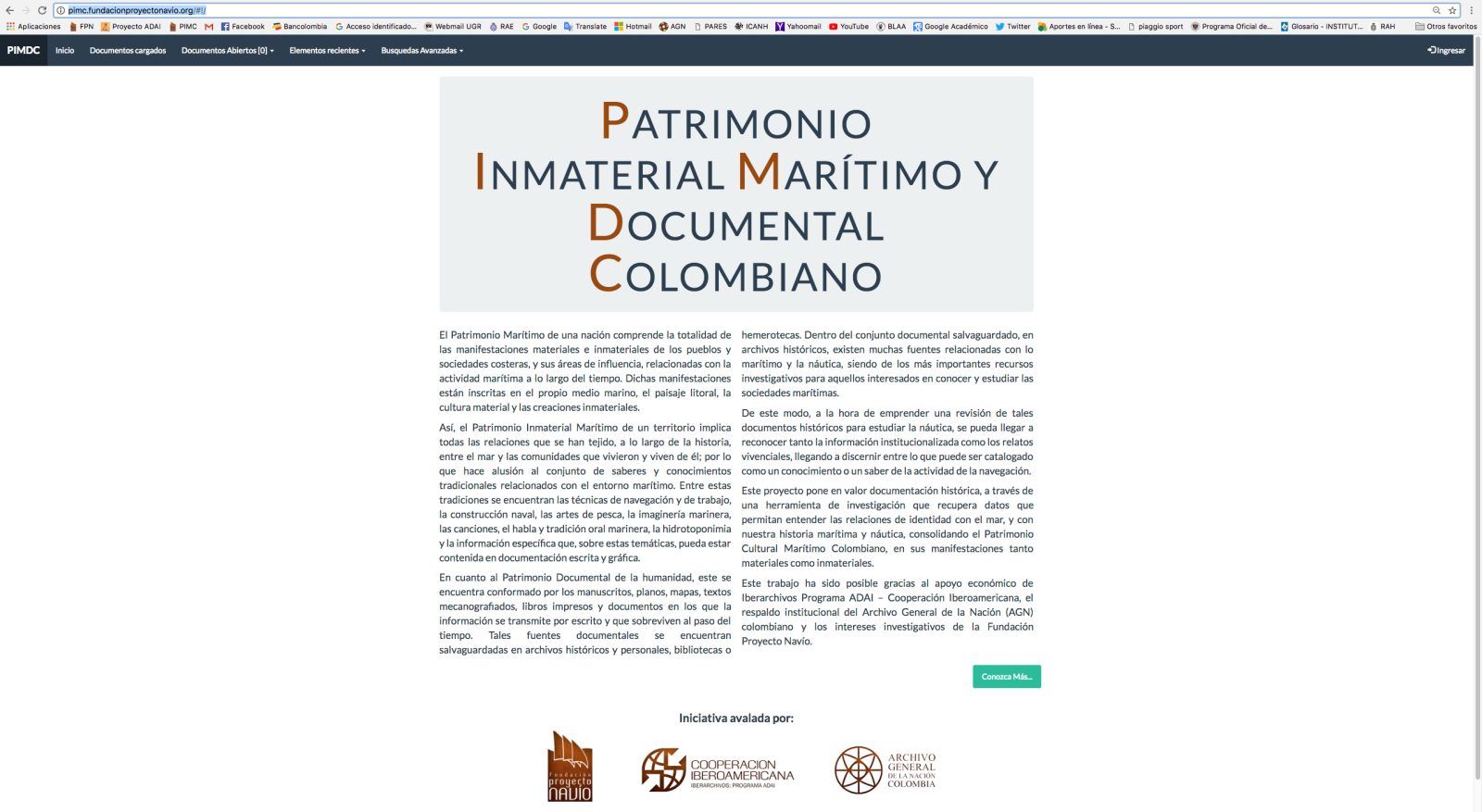 El Patrimonio Inmaterial Marítimo de una nación comprende todas las relaciones que se han tejido, a lo largo de la historia, entre el mar y las comunidades que vivieron y viven de él. Dentro del conjunto documental salvaguardado en archivos existen muchas fuentes relacionadas con lo marítimo y la náutica, siendo estos recursos investigativos importantes para los que estudian las sociedades marítimas. Este proyecto planteó la creación de una herramienta investigativa en la que se pudiera sistematizar de manera lógica y ágil, la mayoría de datos históricos relacionados con temas náuticos y marítimos del territorio del Nuevo Reino de Granada (actual Colombia), contenidos en los manuscritos del Fondo Milicias y Marina del Archivo General de la Nación de Colombia. Para ello, se construyó una base de datos correlacional llamada PIMDC que es utilizada por medio de un aplicativo web que permite tanto sistematizar como efectuar consultas especializadas en la documentación histórica.