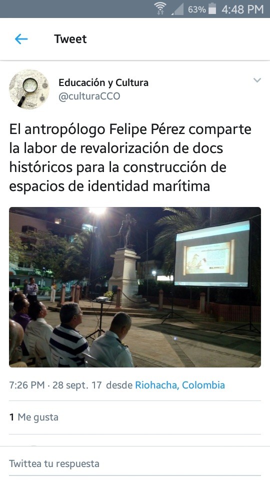 - Tweet @culturaCCO sobre charla impartida en el Simposio Internacional de Historia Marítima
