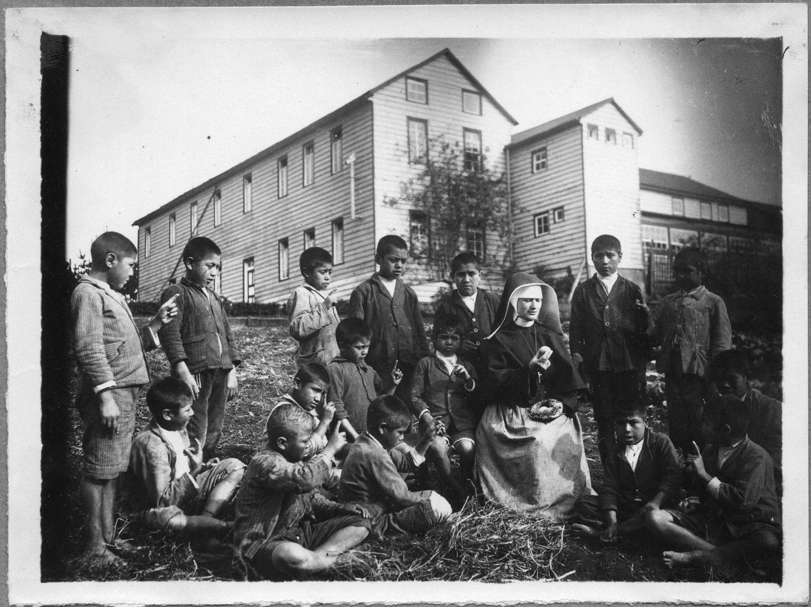 - 6 Misionera educadora junto a niños en escuela indígena Stella Maris, Puerto Saavedra, región de la Araucanía. No se especifica fecha de creación de la fotografía