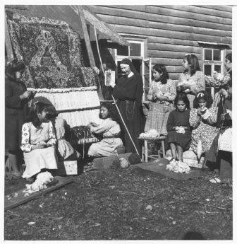 - Grupo de niñas aprendiendo el oficio del telar junto a hermana misionera