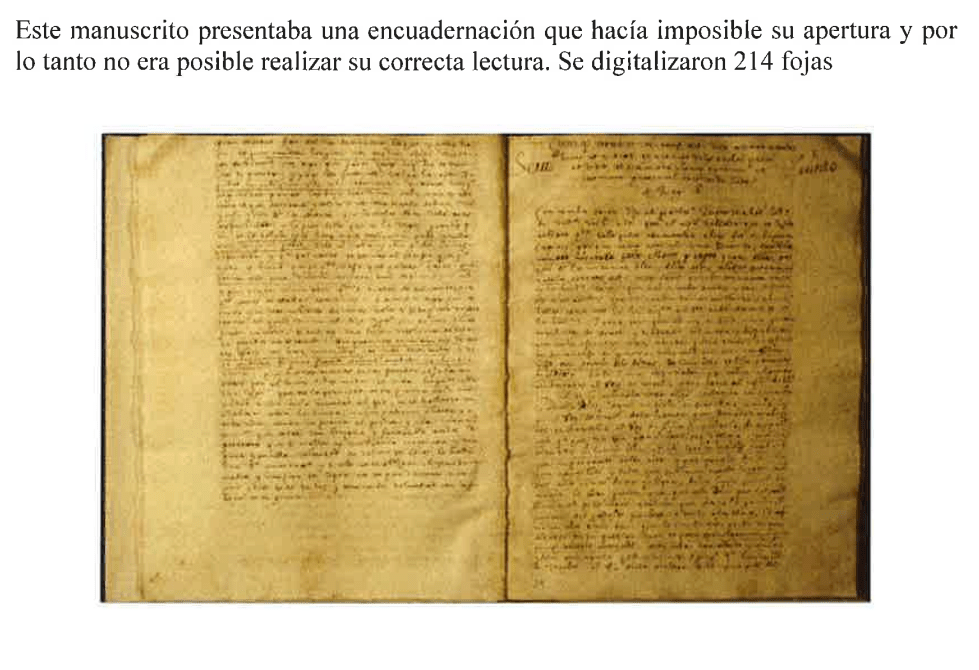 Evitar la manipulación de los manuscritos y documentos frágiles o deteriorados. Mejorar el acceso a los mismos ofreciendo copias digitales de alta calidad. Restauración de los manuscritos más frágiles correspondientes a la época colonial y que representan el mayor riesgo de pérdida. Encuadernación de los manuscritos que presenten sus encuadernaciones en peor estado de conservación.