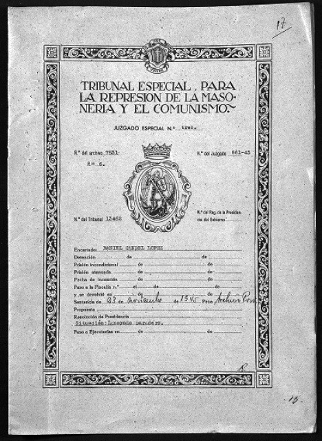 - Portada del expediente del Tribunal de Represión contra Daniel Candel, exiliado en Argentina