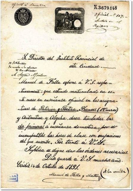 - Documento escolar de Manuel de Falla, exiliado en Argentina en la posguerra