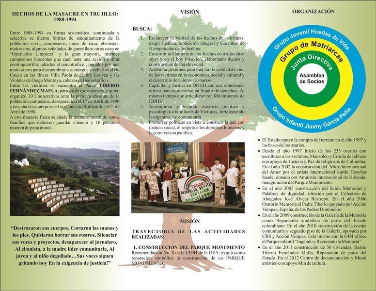 2011/039 Recuperación de la memoria colectiva de la Asociación de Familiares de Víctimas de Trujillo – Valle del Cauca. En búsqueda de la verdad, la justicia y la reparación a las víctimas del conflicto armado en Colombia (2ª fase)En esta segunda fase se ha continuado con el trabajo de organización de archivos en los últimos cinco años, 2005-2010, avanzando en la formación de miembros AFAVIT (Asociación de Familiares de las Víctimas de Trujillo-Valle) y personal-guías en la apropiación y manejo de archivos. Debido a que las fotos se encontraban en avanzado estado de deterioro debido al tiempo y exposición a la luz, se ha hecho la clasificación y se ha realizado una impresión de 171 fotos de Víctimas en papel fotográfico en blanco y negro y se han reemplazado las anteriores.