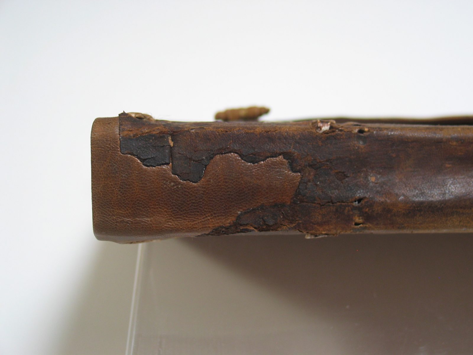 En la cubierta de piel de los libros se realizaron también la limpieza, el tratamiento especial en algunas manchas, la hidratación, la reposición de faltantes y, en algunos casos, la confección de elementos de cierre.