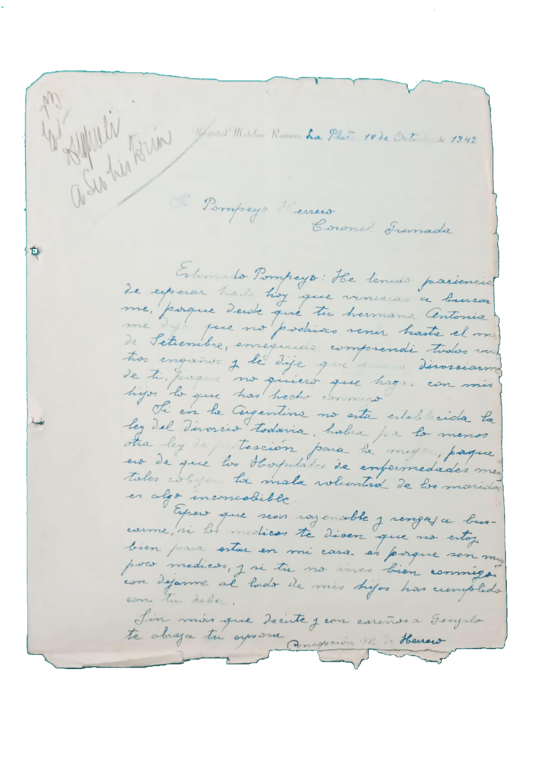 Ela também conta sobre as guerras que começaram na Argentina, escreve ao marido, em resposta à falta de respostas dele e ao seu desejo de se divorciar dele, dizendo-lhe: “Se na Argentina ainda não foi estabelecida a lei do divórcio, pelo menos haverá outra lei de proteção à mulher, porque é inconcebível que os hospitais para doenças mentais coloquem a má vontade dos maridos nas mãos dos maridos”. “Se os médicos lhe dizem que não estou bem o suficiente para ficar em minha casa, é porque há poucos médicos e se o senhor não vive bem comigo, deixando-me com meus filhos, cumpriu seu dever”.