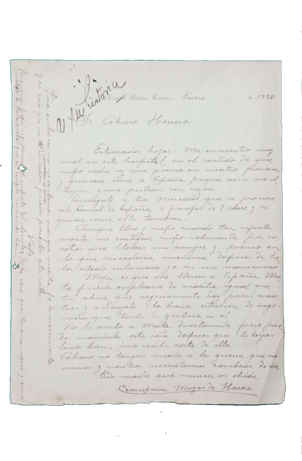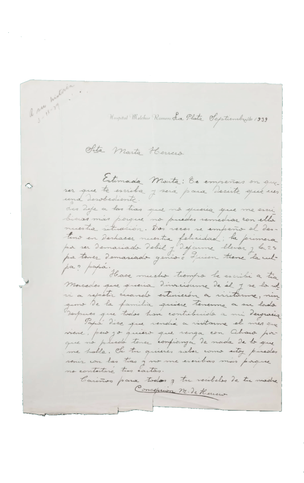 Em particular, a que compartilhamos aqui mostra um eixo fundamental: as mulheres presas por seus maridos. Embora a carta seja datada de 1942, a senhora estava no Hospital desde 1937, tinha 36 anos, era de nacionalidade espanhola e, na época de sua internação, morava em uma cidade da província de Buenos Aires, a mais de 500 quilômetros do Hospital. Nessas cartas, ela escreveu para seus filhos, contando-lhes como se sentia mal no Hospital, bem como seus planos futuros de retornar à Espanha, já que a guerra havia terminado.