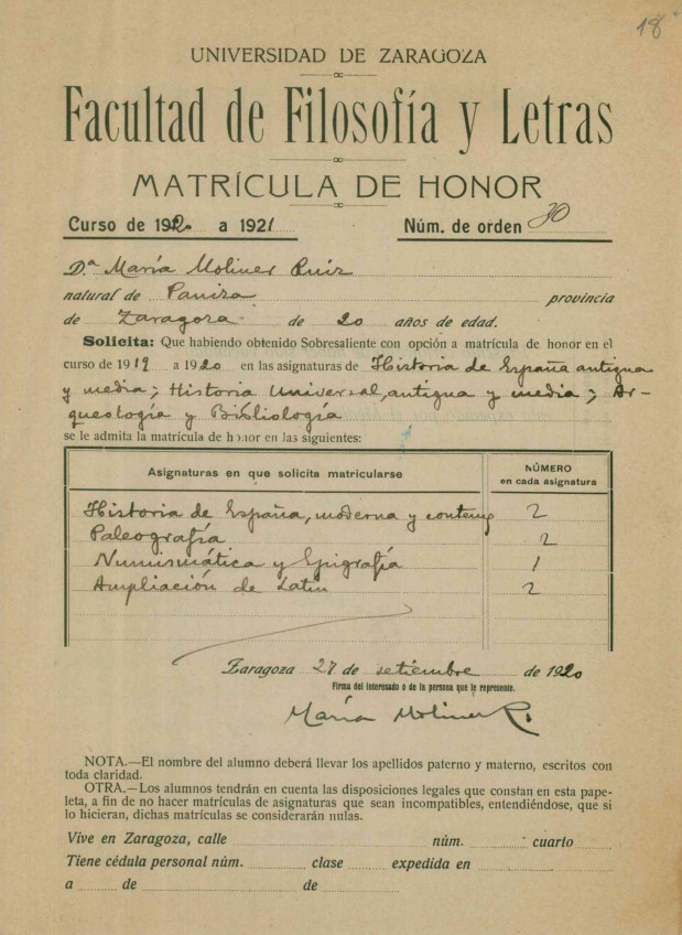 No dossier pessoal de estudante de María Moliner podemos aceder ao seu cartão de identificação escolar, com a sua assinatura e fotografia, bem como a um resumo das suas notas nos exames ordinários e extraordinários que realizou entre os anos lectivos de 1918/1919 e 1921/1922. O seu brilhantismo académico durante os anos em que estudou na faculdade continua a surpreender, com 10 distinções.