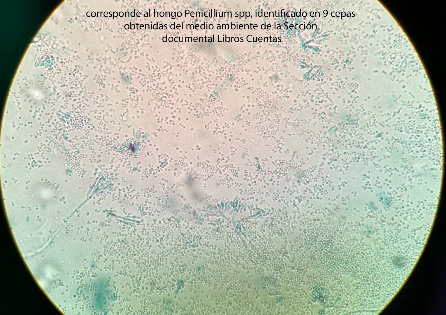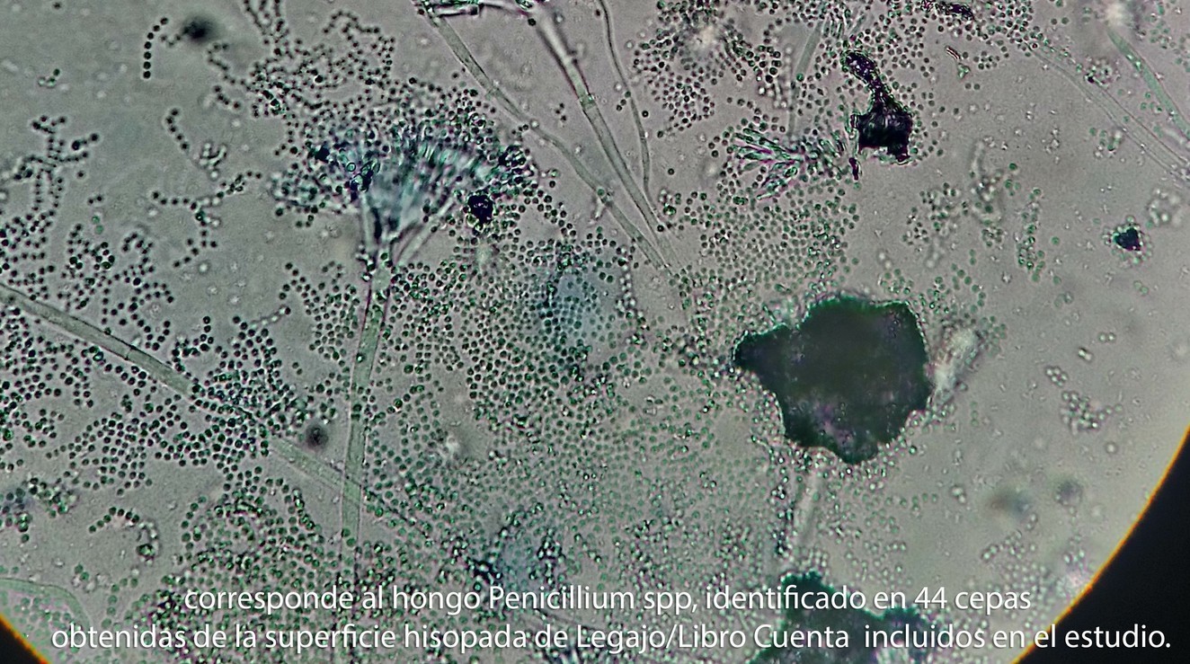 - Corresponde al hongo Penicillium spp, identificado en 44 cepas obtenidas de la superficie hisopada de Legajo/Libro Cuenta incluidos en el estudio.