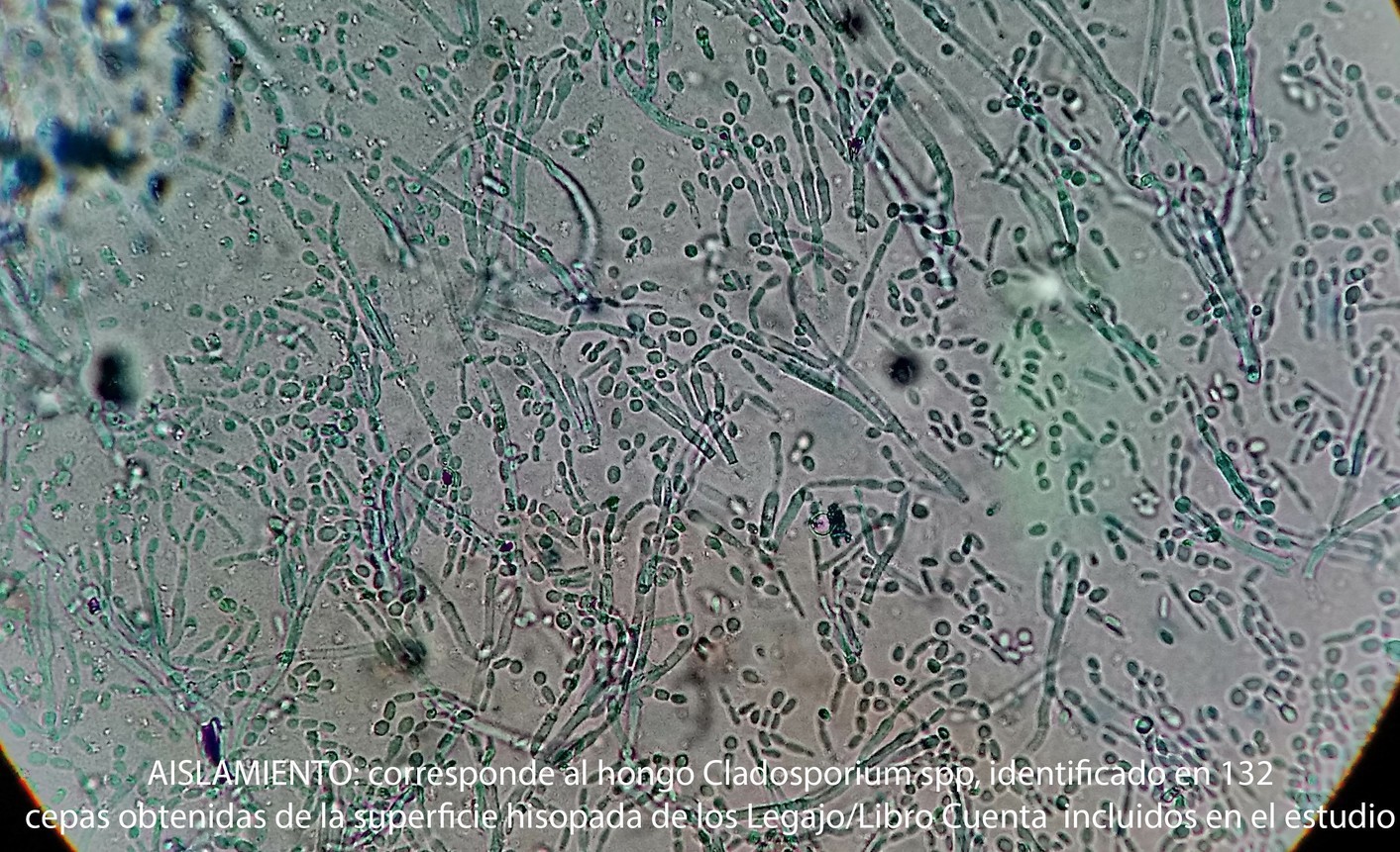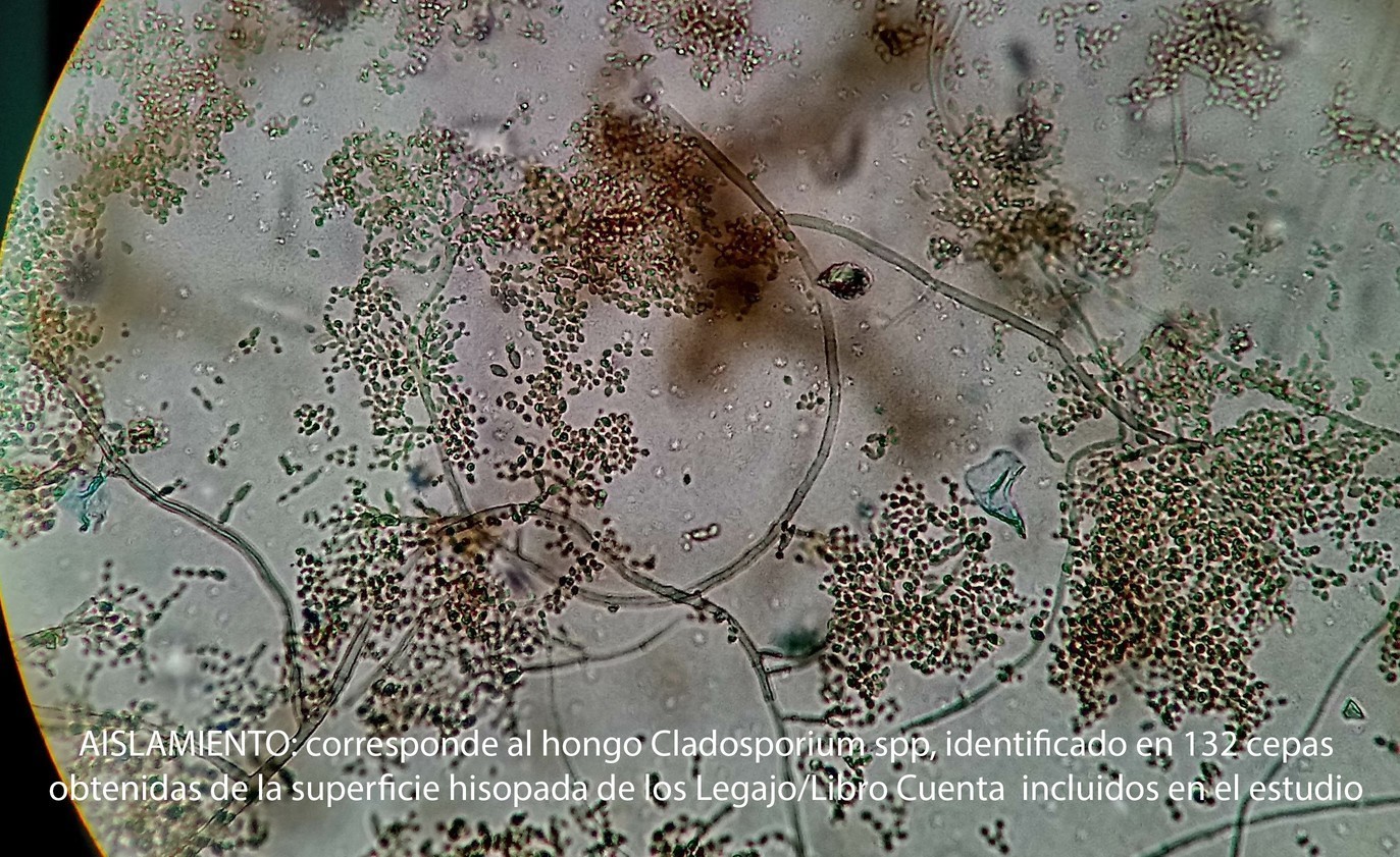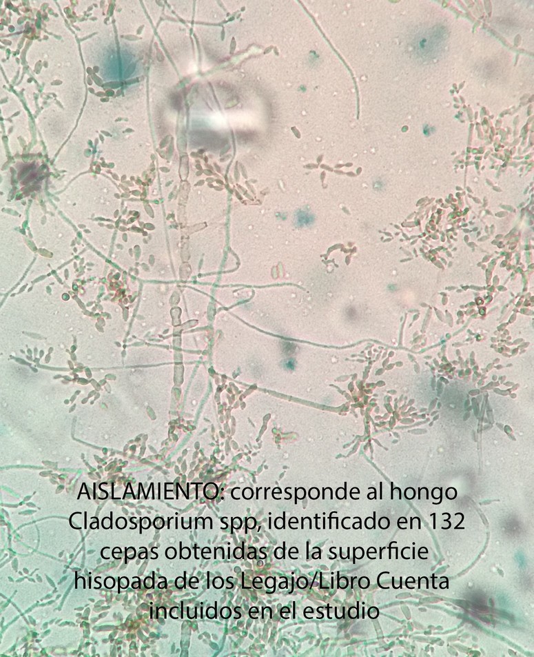 - AISLAMIENTO, corresponde al hongo Cladosporium spp, identificado en 132 cepas obtenidas de la superficie hisopada de los Legajo/Libro Cuenta incluidos en el estudio