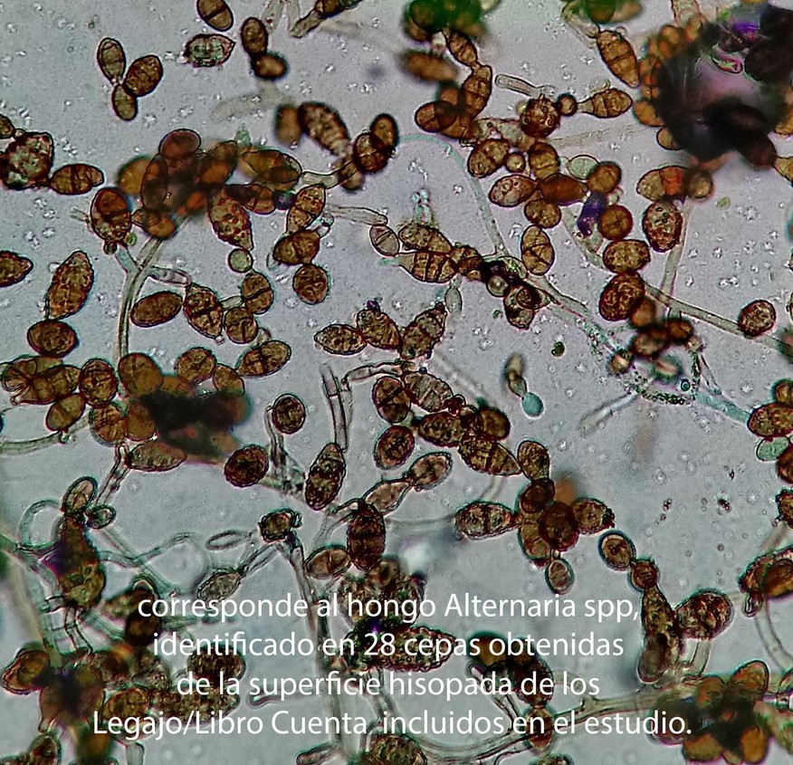 - AISLAMIENTO, corresponde al hongo Alternaria spp, identificado en 28 cepas obtenidas de la superficie hisopada de los Legajo/Libro Cuenta incluidos en el estudio.