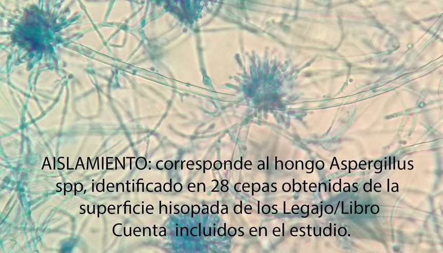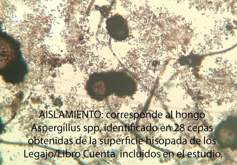 - AISLAMIENTO, corresponde al hongo Aspergillus spp, identificado en 28 cepas obtenidas de la superficie hisopada de los Legajo/Libro Cuenta incluidos en el estudio.