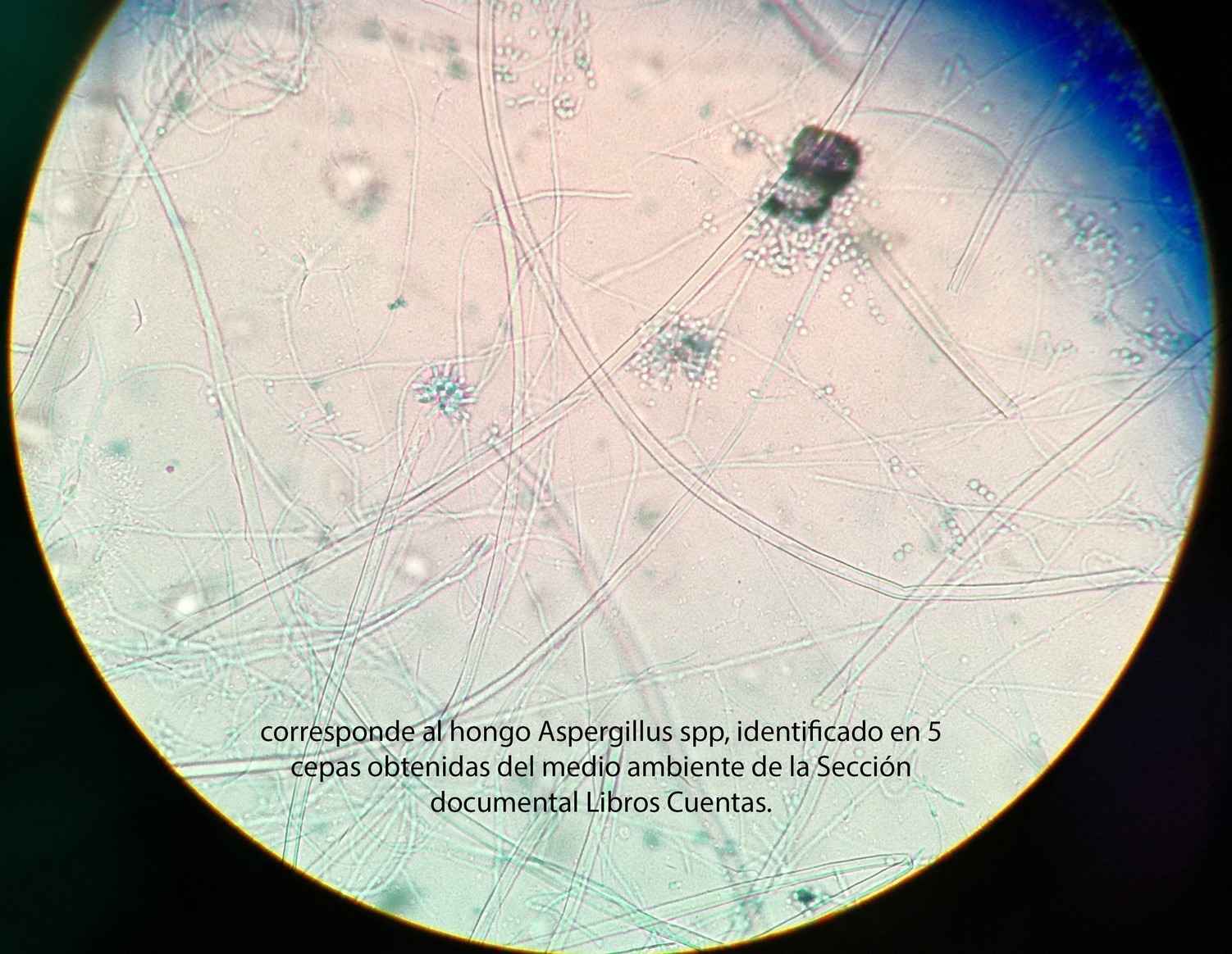 - AISLAMIENTO, corresponde al hongo Aspergillus spp, identificado en 5 cepas obtenidas del medio ambiente de la Sección documental Libros Cuentas.