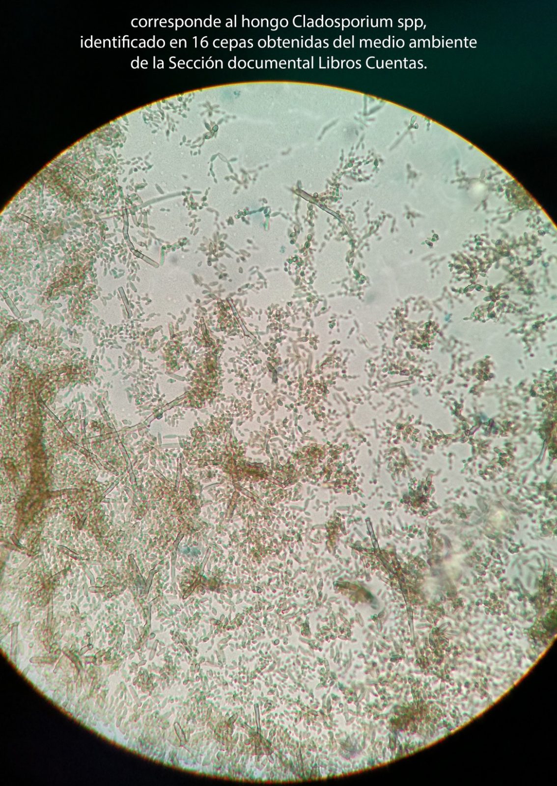 - AISLAMIENTO, corresponde al hongo Cladosporium spp, identificado en 16 cepas obtenidas del medio ambiente de la Sección documental Libros Cuentas.