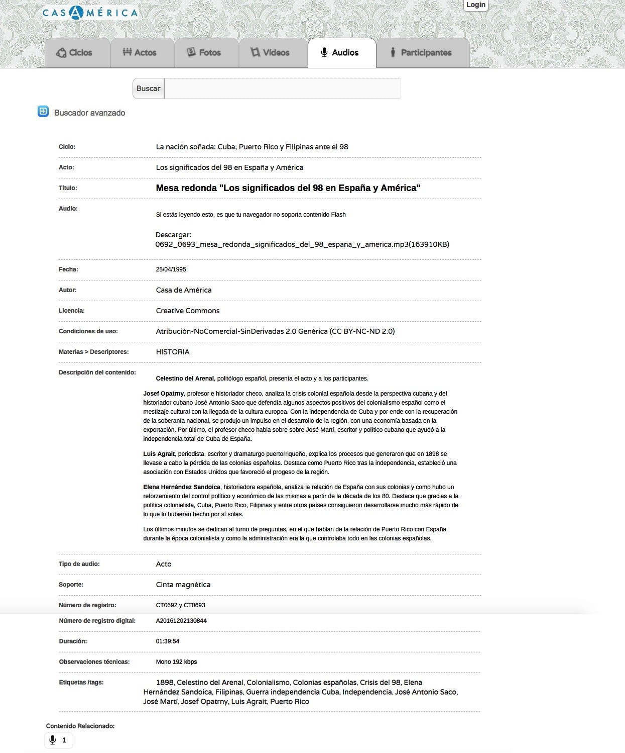Informe del proyecto 2016/113 Digitalización y catalogación de archivos de audio de conferencias de La Casa de América (1992-1995) (1ª fase)