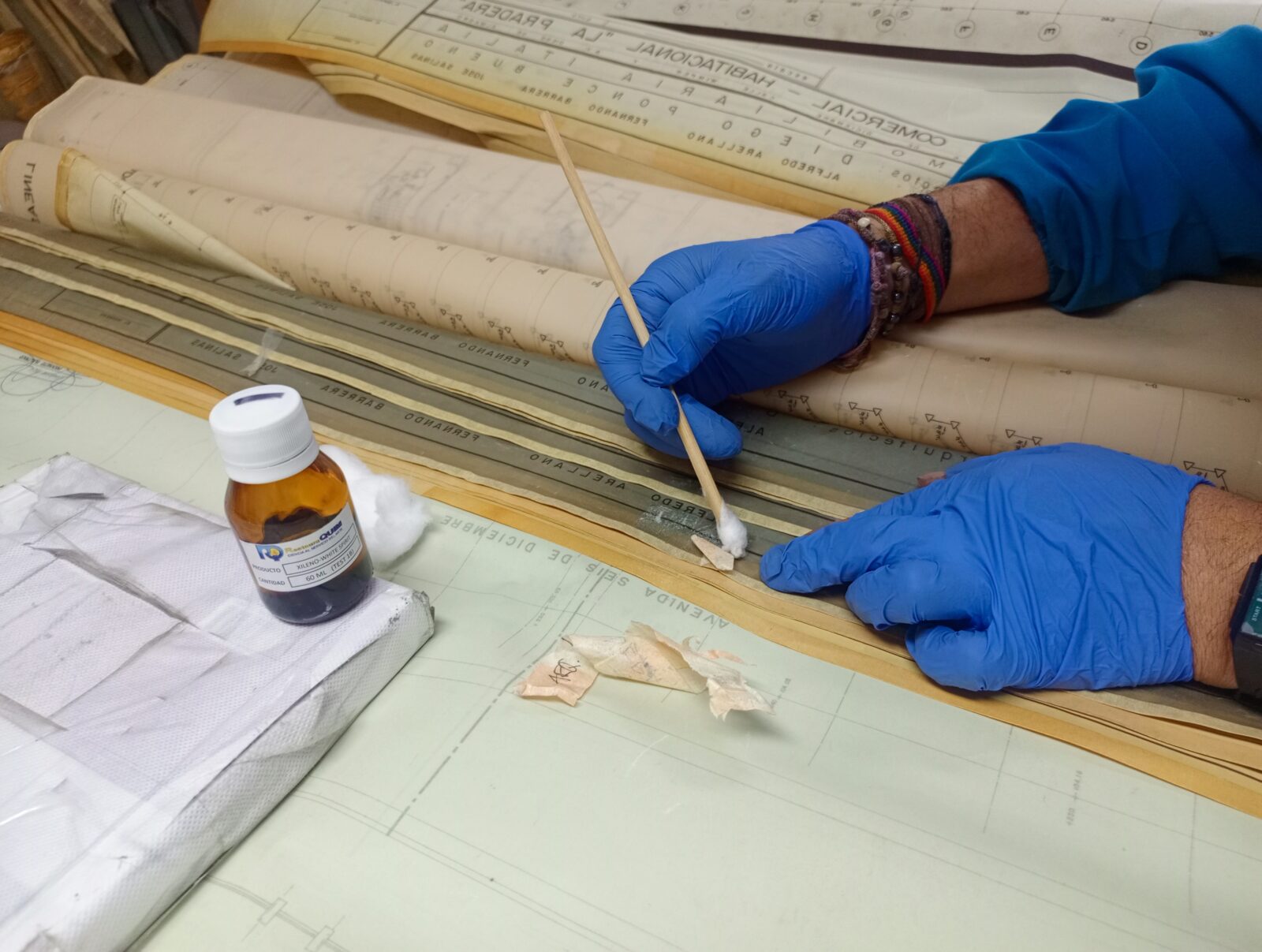 O acervo documental de plantas do Arq. Diego Ponce, que inicialmente era composto por cerca de 8.000 plantas, foi doado ao Centro Documental do INPC no ano de 2022 e, a partir desse momento, foram realizados diversos processos de manutenção e ações de proteção preventiva para sua salvaguarda; No entanto, a situação do acervo era alarmante devido ao fato de que os agentes extrínsecos aos quais o acervo foi exposto durante seu armazenamento anterior, antes da doação, causaram efeitos adversos na integridade física da documentação, aumentando as quebras e deformações no suporte, e também gerando um acúmulo considerável de poeira e sujeira a ponto de gerar uma possível proliferação de biodeterioração com danos significativos à documentação. Além disso, embora 60% da documentação esteja armazenada em caixas, sua proteção e organização não foram garantidas devido ao alto nível de desgaste e deterioração das caixas, comprometendo a conservação e a acessibilidade da documentação.