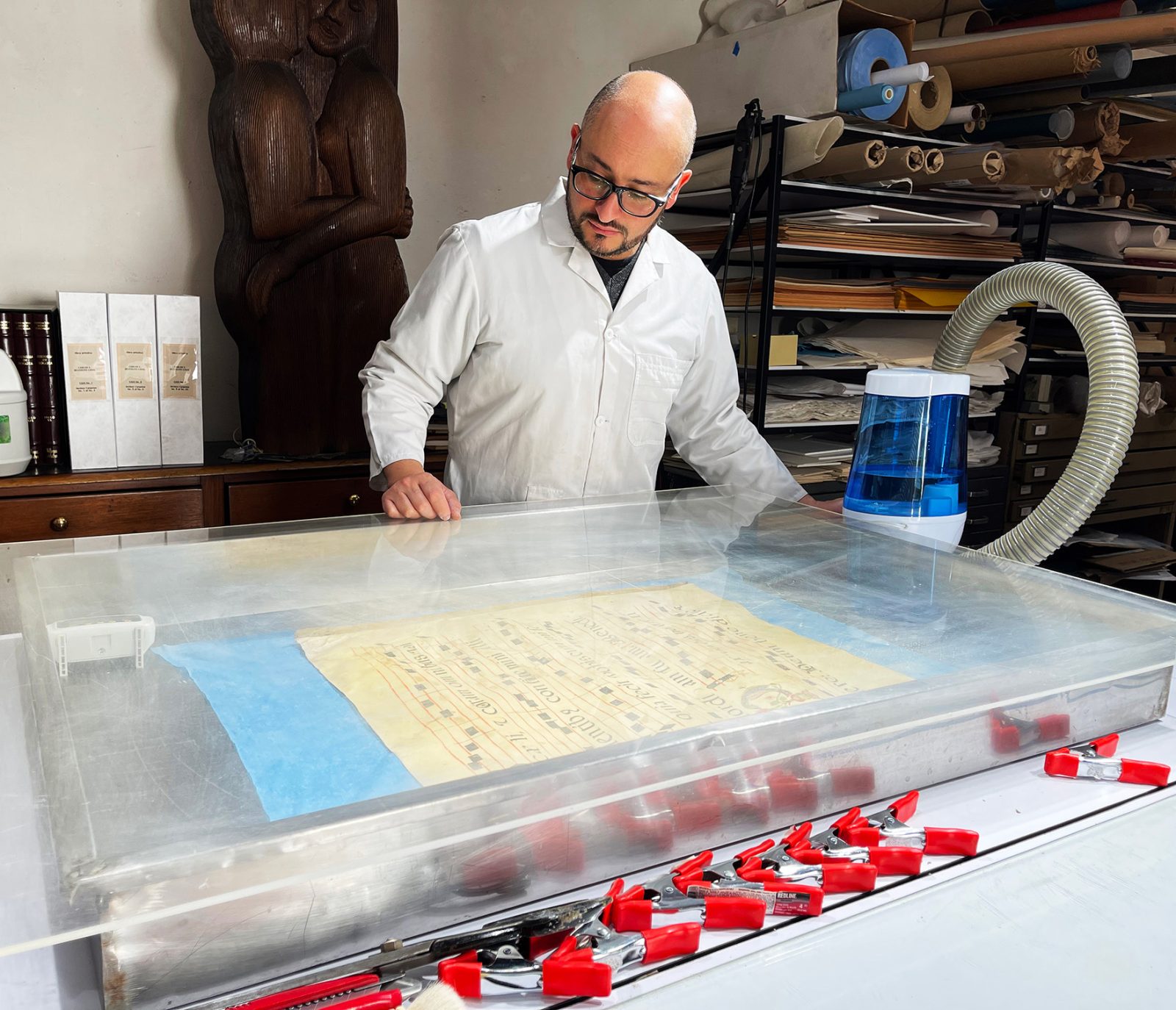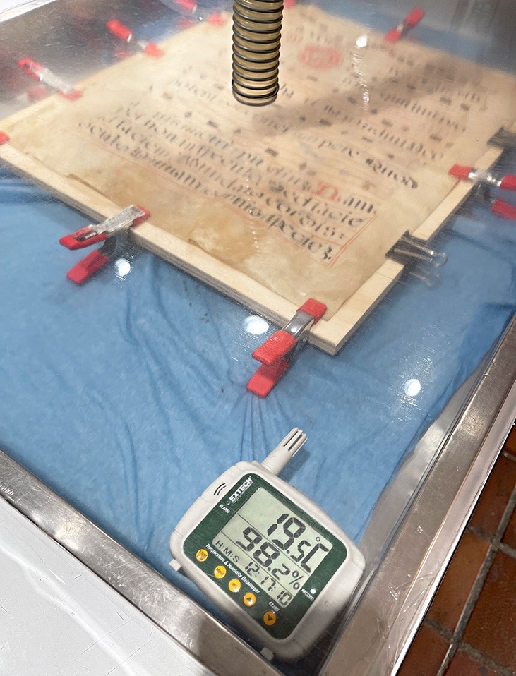 - Dentro de una cámara de humidificación con temperatura y humedad controladas, se humectaron una a una las hojas que conforman el libro