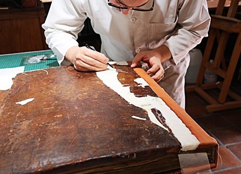 - Injertos en papel japonés para cubrir los faltantes del soporte cuero en las tapas
