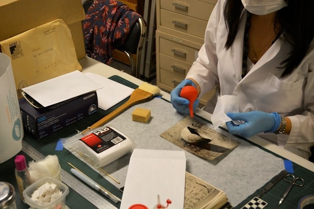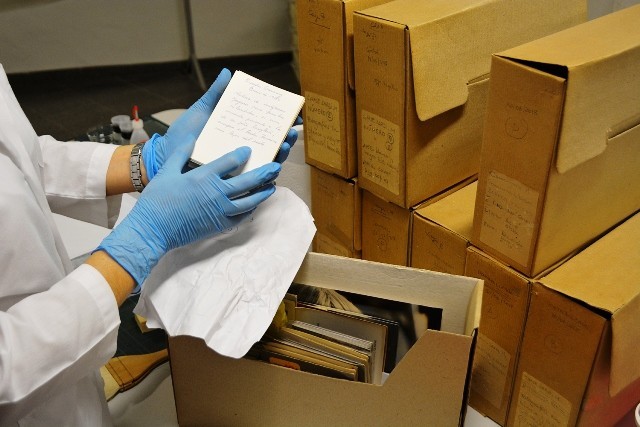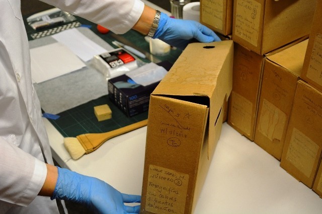 - Cajas de conservación y vista de rótulos originales conservados en sobres especiales