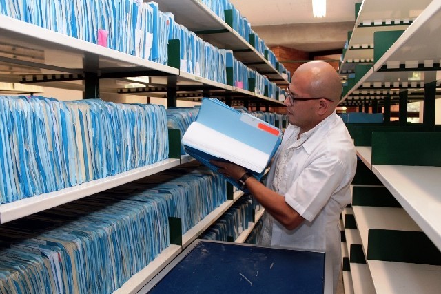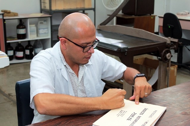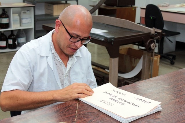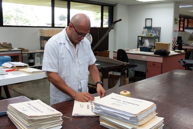 - El contratista Steve Fonseca Fernández prepara los expedientes de índices notariales para ser cosidos.