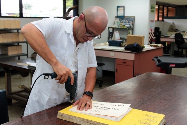 - El contratista Steve Fonseca Fernández perfora con un taladro el lomo de los expedientes de índices notariales.