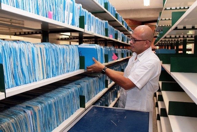 - El contratista Steve Fonseca Fernández revisa y traslada al Departamento de Conservación los expedientes de índices notariales para prepararlos.