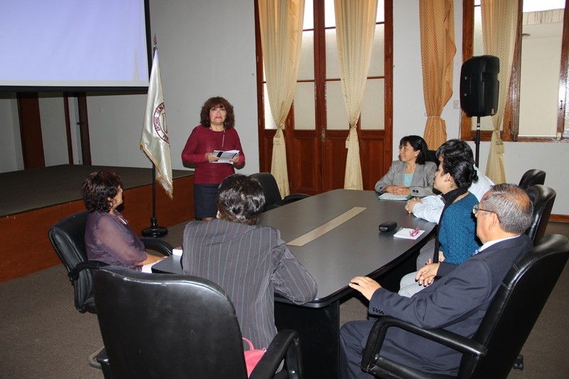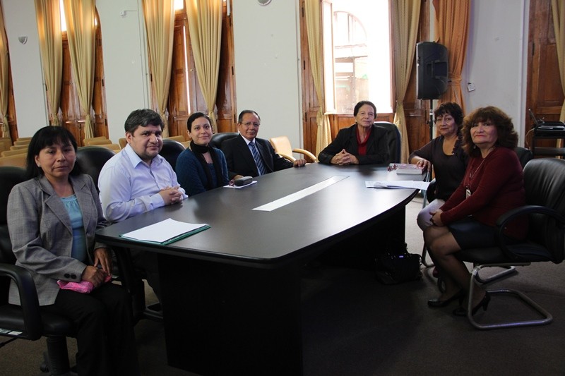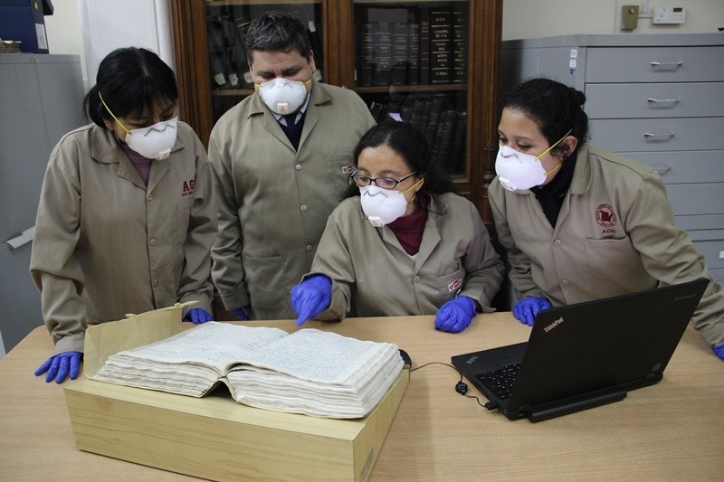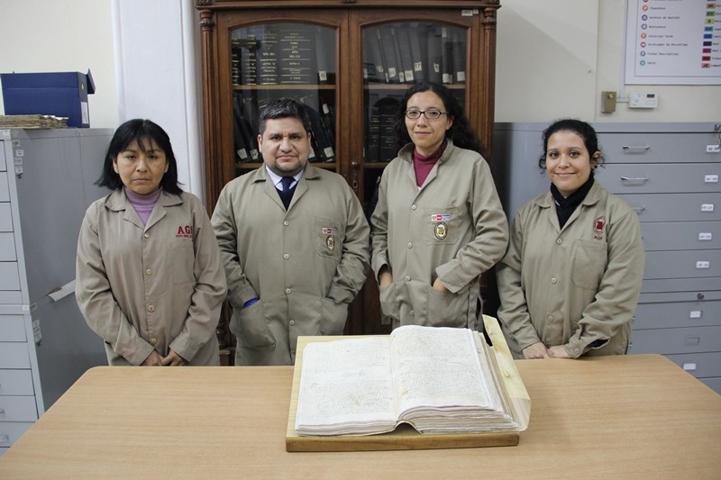 - De derecha a izquierda: Lic. Doris Argomedo Cabezas, Directora de Archivo Colonial, Ruth Borja Santa Cruz, Docente, Teresa Carrasco Cavero, Jefa Institucional, Eco. Eleodoro Balboa, Director Nacional de Archivo Histórico, Elena Botton Becerra, Bernardo Reyes Cueva y Cecilia miranda Jimenez, historiadores paleógrafos de la DAC.